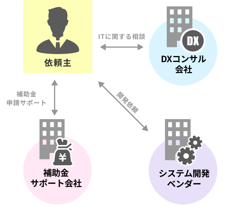 IT支援(DXコンサル)と補助金サポートを別の業者に依頼した場合、補助金サポート業者と、IT支援業者それぞれ別でやりとりが発生します。