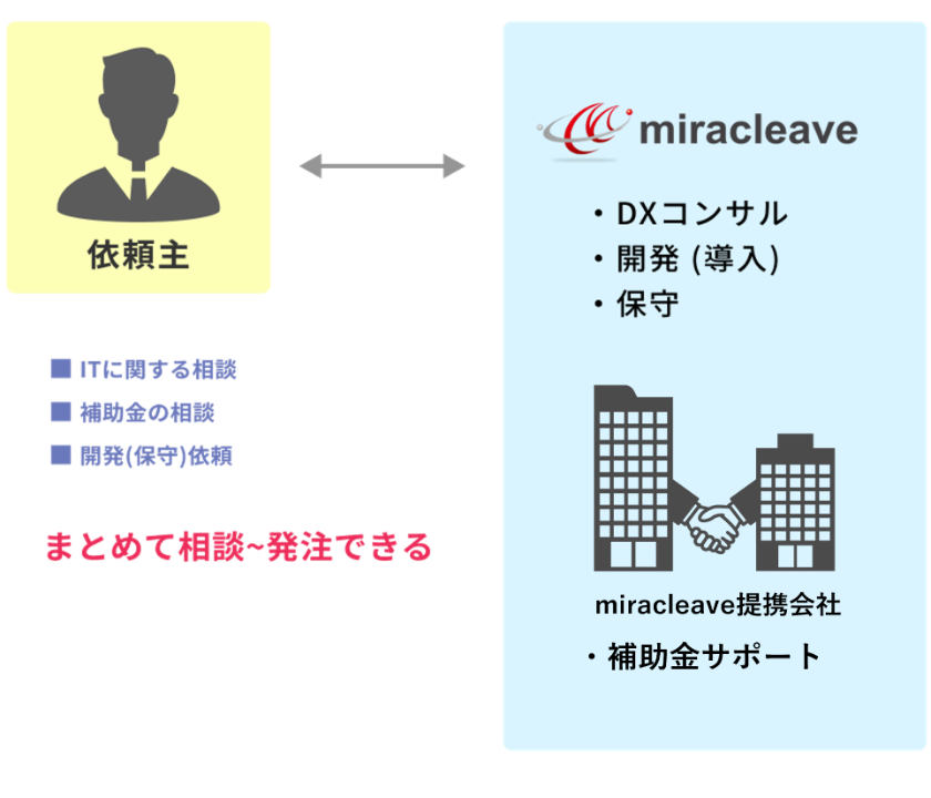 そこでmiracleaveのワンストップサポートの場合は、miracleaveが窓口となり、補助金サポートの業者とのやりとりを行うことで、窓口の対応コストが減り、企業間の認識齟齬もなくなります。