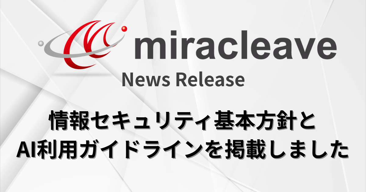 miracleave株式会社(本社:東京都中央区、代表取締役社長:松本 昌大、以下、当社)は、会社HPに情報セキュリティ基本方針とAI利用ガイドラインを掲載しました。